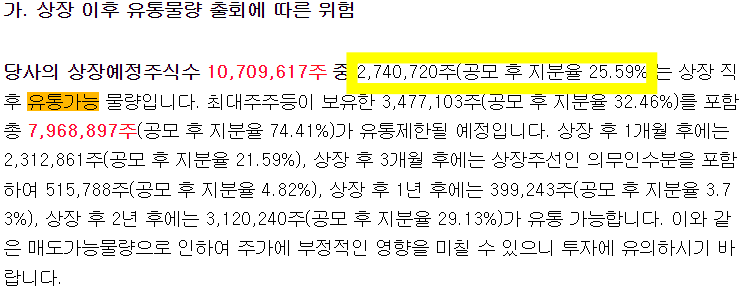 노머인 증권신고서에 상장일 유통 물량은 25.59%인 274만 720 주로 나와 있습니다. 평균 수준과 비슷한 물량입니다.
