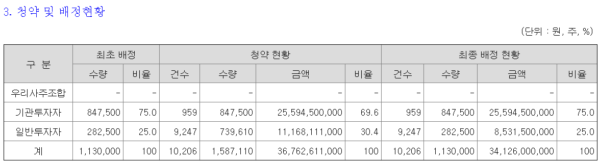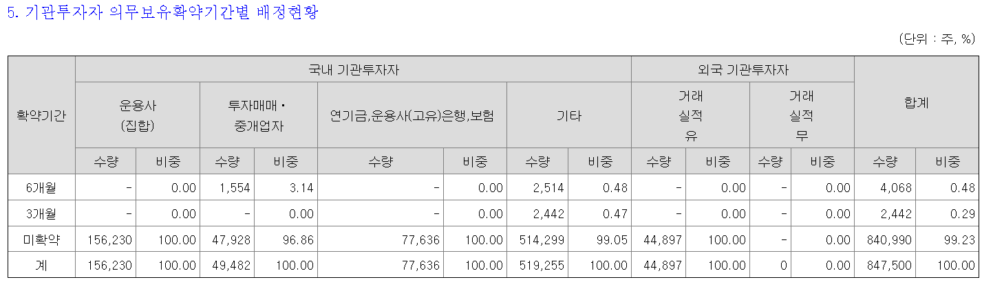 기관투자자의 의무보유확약 비율 0.77%로 미미한 수준으로 6,510주 밖에 되지 않습니다.