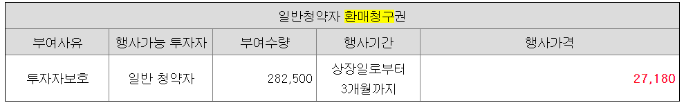 노머스 공모주 받은 분들은 주당 27,180원으로 주관사인 대신증권에 환매청구할 수 있으니 이 점 확인하시기 바랍니다.