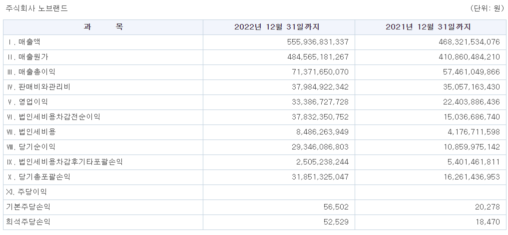 노브랜드는 2023년 연결 기준 매출 5500억원, 영업이익은 470억을 달성했습니다. 2021년과 비교하여 매출 18%, 영업이익은 130% 성장하였고 당기순이익은 170% 증가하여 300억원을 기록했습니다. 이번에 모집한 공모 자금으로는 연구개발과 생산지 다변화를 위해 활용할 계획입니다.