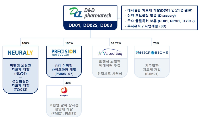 또한, 디앤디파마텍은 양전자 방출 단층촬영(PET) 이미징 바이오마커 개발, 퇴행성 뇌질환 관련 빅데이터 구축 등의 사업을 자회사를 통해 진행하고 있으며, 알파 방사선 항암제 개발에 관련된 기술을 미국의 회사에 현물출자하여 2대 주주로 참여하고 있습니다.