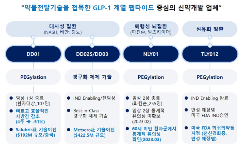 디앤디파마텍은 페길화(PEGylation) 기술과 주사제 약물을 경구화 제제로 전환하는 플랫폼 기술을 활용해 GLP-1 계열 펩타이드 근간의 약물 개발에 강점을 가지고 있습니다. 이를 통해 파킨슨병, 알츠하이머병, 비알콜성지방간염(NASH) 및 섬유화 질환 치료제 개발에 성공했으며, 글로벌 파트너사와 함께 추가적인 비만 치료제 개발도 진행 중입니다.