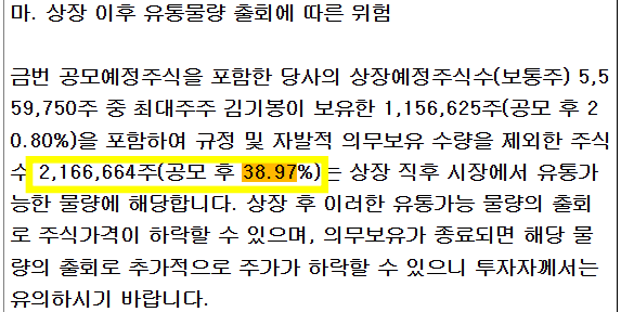 유통물량이 평균보다 많은 수준이며 상장 한달 이후부터 56%로 물량이 많이 늘어날 예정이라 주가 하락에 영향받을 수 있으니 유의해야 겠습니다.