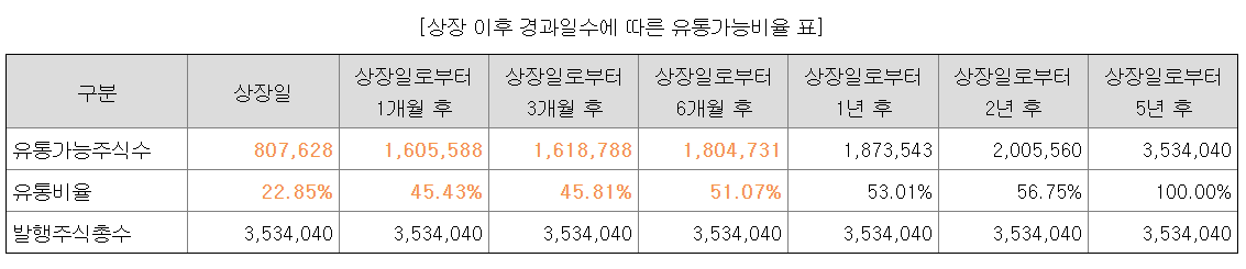 공모 시 상장 직후 유통가능물량은 807,628주 (상장예정주식수 3,534,040주의 22.85%)입니다. 상장일로부터 1개월 후에는 벤처금융 등의 소유주식수 797,960주가 의무보유 해제 되어 유통가능 물량은 1,605,588주(상장예정주식수의 45.43%)로 증가합니다. 상장일로부터 3개월 후에는 상장주선인 의무인수분인 13,200주가 의무보유 해제되며, 상장 후 6개월 후에는 185,943주가 의무보유 해제되어 유통가능 물량은 1,618,788주(상장예정주식수의 45.81%)로 증가합니다. 우리사주조합 예탁일일로부터 1년 후에는 우리사주조합 우선배정 물량 68,812주가 의무보유 해제될 예정이며, 최대주주등이 소유한 주식 중 132,017주는 상장일로부터 2년 후, 1,528,480주는 상장일로부터 5년 후 의무보유 기간이 만료됩니다. 이와 같은 매도가능물량으로 인하여 주가에 부정적인 영향을 미칠 수 있으니 투자에 유의하시기 바랍니다.
