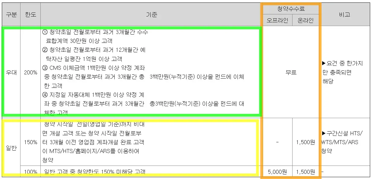 온라인 청약시: 우대등급은 무료, 일반등급은 1500원