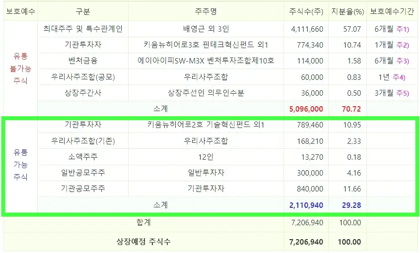 최대주주를 비롯하여 벤처금융 등의 주요주주의 보호예수는 70.72%로 509만 6000주입니다. 상장 직후 유통 물량은 29.28% 로 많지 않아 상장일 주가 하락에 영향을 주는 수치는 아닙니다. 상장 당일 유통 가능 주식수는 2,110,940주입니다.