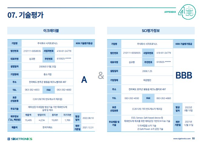 시지트로닉스는 기술력을 인정받아 기술평가기관인 SCI평가정보로부터 BBB등급, 이크레더블로부터 A등급을 받았습니다.