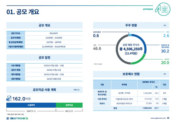 시지트로닉스는 전체 90만주 신주 모집을 목표로 공모 중이며, 희망 공모밴드는 주당 1만 8000원에서 2만 원입니다. 희망밴드 상단을 초과한 25,000원으로 공모가가 확정되었습니다.