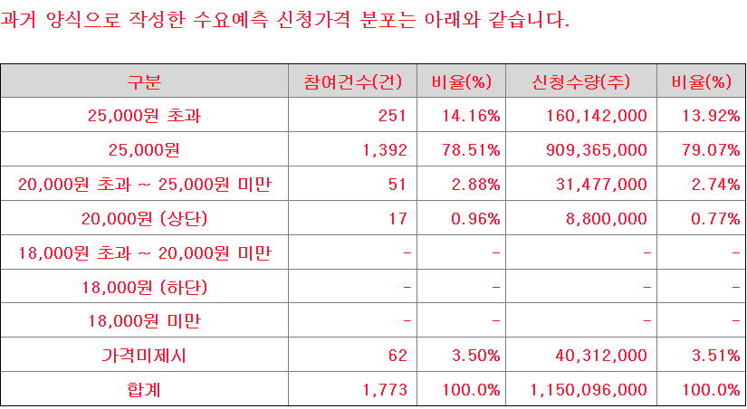 7월 18일과 19일 기관투자자를 대상으로 한 수요예측에서 기관 경쟁률은 1,703.85대 1을 기록했습니다. 희망공모가 상단을 초과하는 가격을 신청한 기관이 95.7%를 차지할 정도로 높은 평가를 받아 흥행에 성공했습니다.