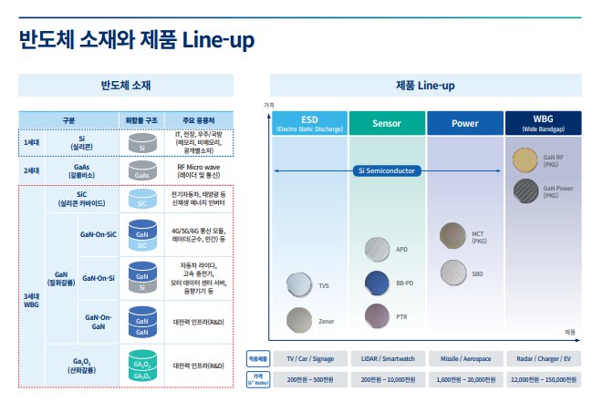 Power소자는 전기에너지를 활용하기 위하여 스위칭, 직류교류 변환, 전압 및 주파수 변조 등의 제어 기능을 제공합니다. 전기자동차를 비롯하여 전기로 구동되는 모든 기기에는 Power소자가 사용되며 에너지 효율, 크기, 무게, 냉각(온도)과 같은 요소가 핵심적인 기술적인 사항입니다. 당사의 Power 소자는 각종 전력장치 및 모터제어에 사용되어 전력의 생산, 가공, 전송의 전 과정에 관여하기에 5G, 데이터 통신 서버, 자동차와 같은 민간 부문은 물론 군수산업까지 사용됩니다. 당사는 현재 실리콘 소재를 기반으로 한 Power소자를 판매 중입니다. 그러나, 최근 전력반도체의 사용 환경에 따른 반도체 소재의 변화(Si to GaN, SiC)에 대한 수요가 높아짐에 따라 당사 역시도 이에 대한 대응으로 GaN 소재를 통한 전력반도체를 당사의 신규사업으로 목표하고 있습니다.