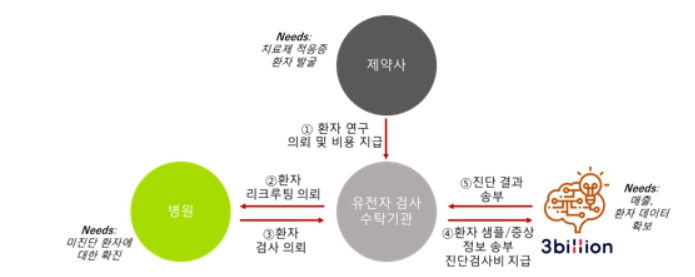쓰리빌리언의 희귀 유전질환 진단 검사 서비스는 진단 과정에서 축적되는 데이터를 활용해 지속적으로 개선되며, 검사 성능 향상과 고객 사용의향 증대로 선순환 구조를 이루고 있습니다.