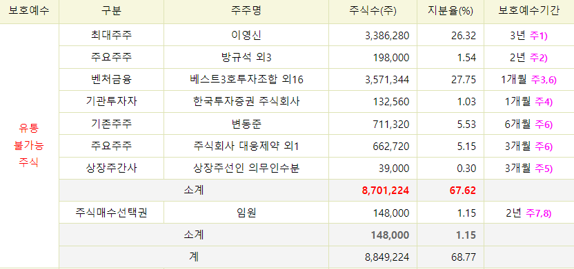 씨어스테크 상장 직후에 유통되는 주식수 물량과 유통이 되지 않는 보호 예수 물량을 알아보겠습니다.