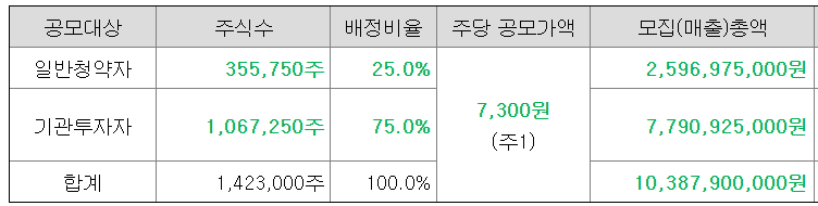 공모가는 희망가액 하단보다 낮은 가격 7300원으로 확정되었습니. 청약한도와 최소 청약주식는 위의 표에서 확인하시기 바랍니다.