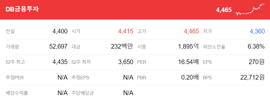 DB금융투자는 증권주 저PBR 관련주에서 1위로 꼽히고 있는데요. 금융업종에 속하며 PBR이 0.28배입니다. 1,800억대 시가총액을 가지고 있으며, 최근 긍정적인 차트 모양을 보이고 있습니다.