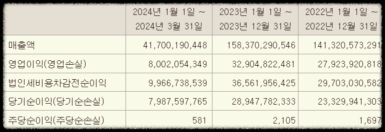 전진건건설로봇의 매출액 및 영업이익 정보입니다. 표에서 볼 수 있듯이 22년부터 23년까지 매출액이 꾸준히 성장하고 영업이익 흑자를 기록하며 성장하고 있습니다. 24년 1분기에도 영업이익 흑자를 기록하고 있습니다.