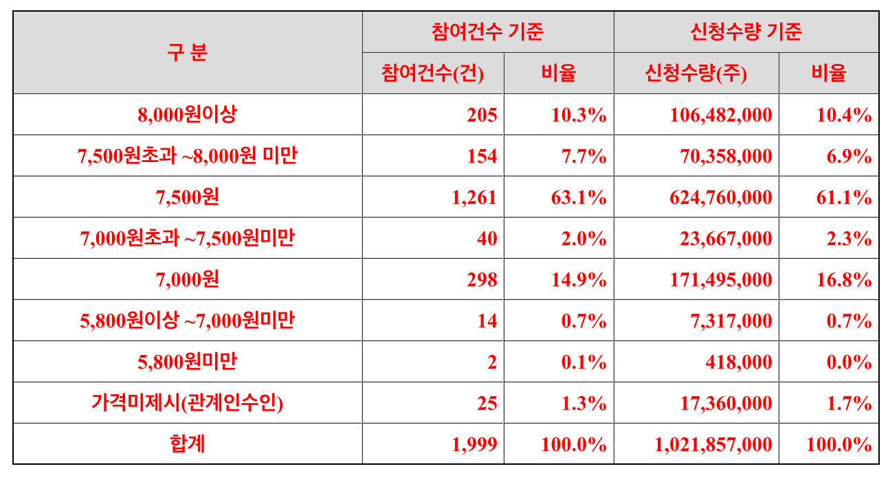 케이웨더의 희망가액은 4800원 ~ 5800원이었는데요. 수요예측에 참여한 기관의 97%가 희망밴드 상단 초과한 7천원 이상의 가격으로 제시하였습니다.