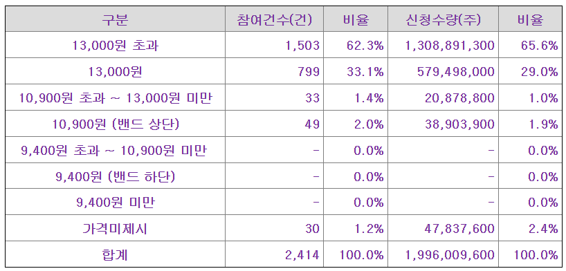 10월 15일 수요예측 결과가 위와 같이 발표되었으며 공모가는 13000원으로 확정되었습니다.