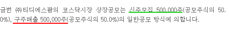티디에스팜은 이번 공모로 총 1백만 주를 모집하며 그 중에 구주 매출이 50%가 있습니다.