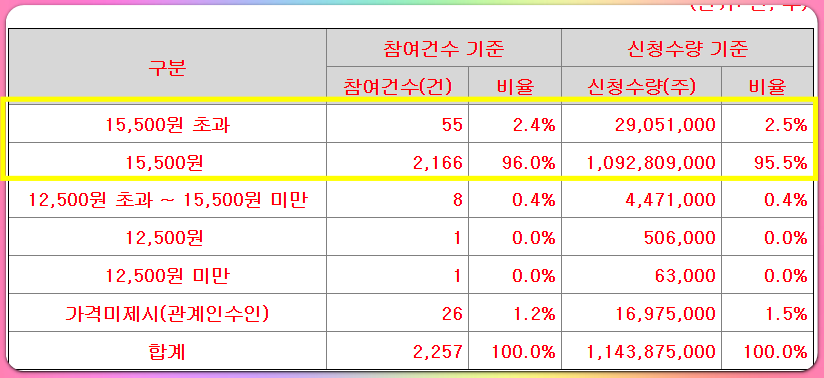 위 표는 수요예측 참여내역입니다. 밴드 상단가인 15,500원으로 공모가 확정되었습니다.