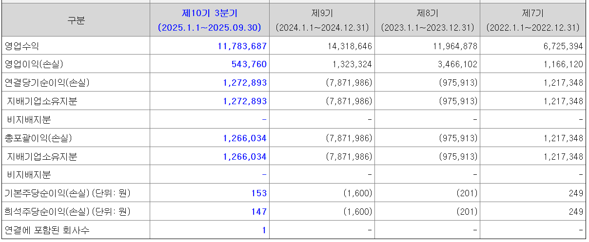 - 2025년 3분기: 153원 (흑자 전환)