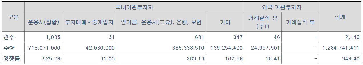 | 기관투자자 배정수 | 1.357,500주 (75%) |