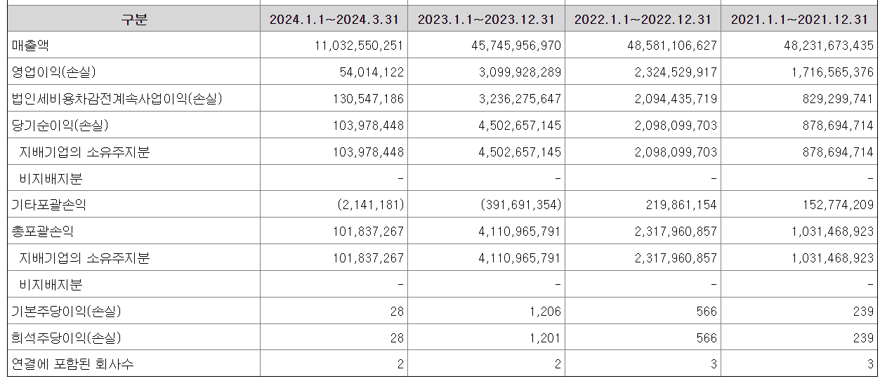 유라클의 매출액 및 영업이익 정보입니다. 표에서 볼 수 있듯이 21년부터 23년까지 매출액이 꾸준히 성장하고 영업이익 흑자를 기록했고 24년 1분기에도 영업이익 흑자를 내며 성장하고 있습니다.