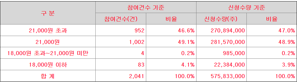 참여 기관의 95.9%가 희망밴드 상단 이상의 가격을 제시하여 공모가가 상단가격인 21000원으로 결정되었습니다.