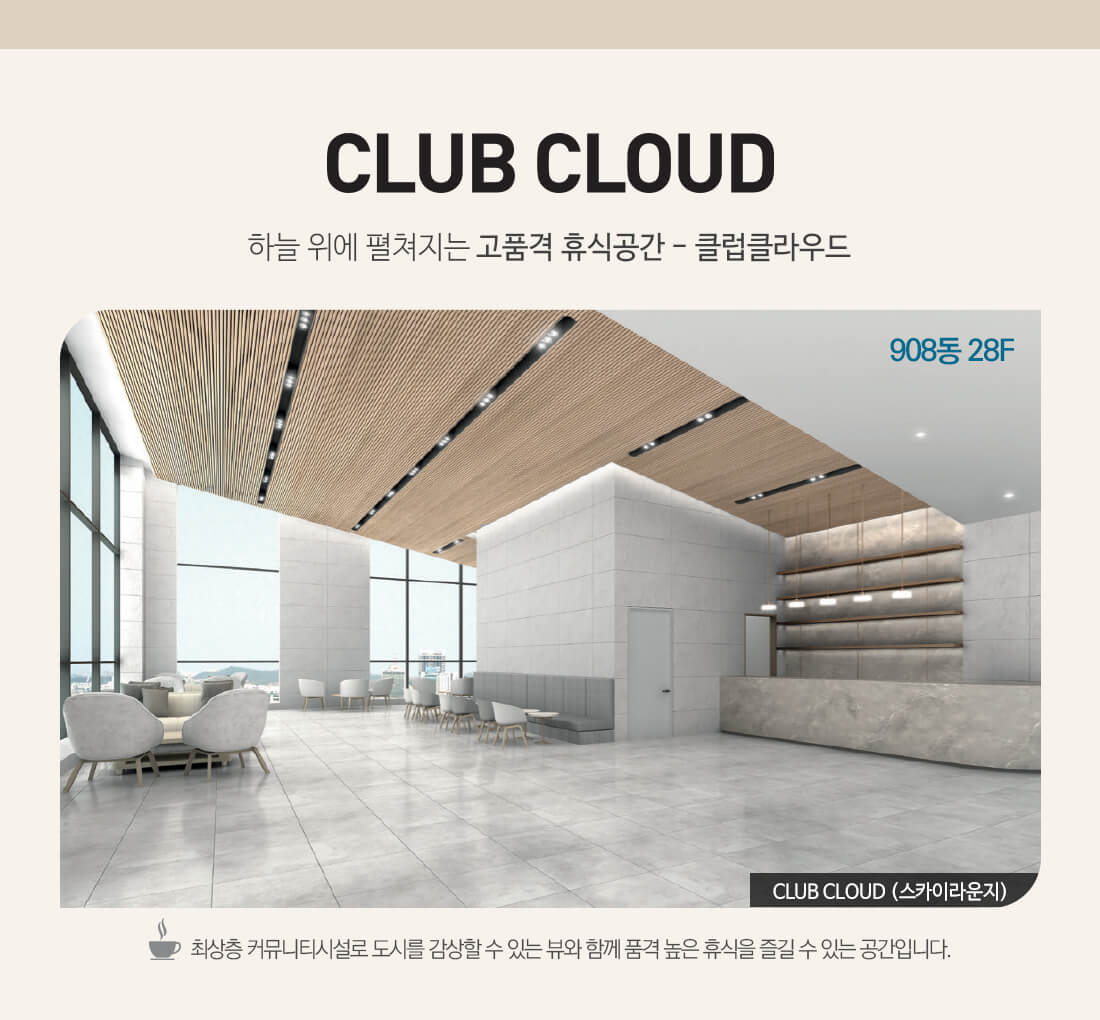 - 클럽 클라우드( CLUB CLOUD): 최상층에 커뮤니티 시설을 조성하여 도시를 감상할 수 있는 뷰와 함께 품격 높은 휴식을 즐길 수 있는 공간입니다.