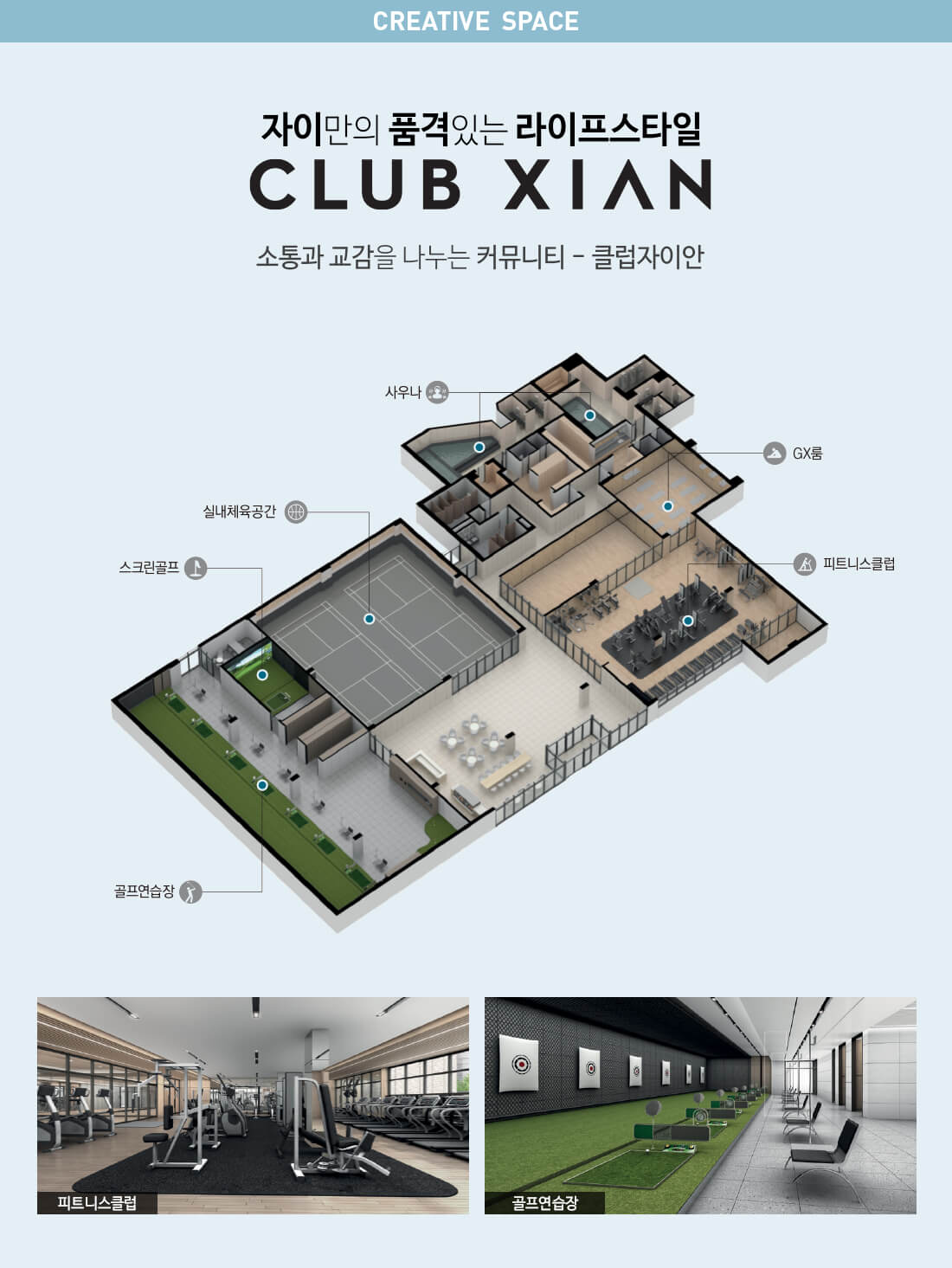 - 클럽 자이안 (CLUB XIAN): 아파트 입주민이 이용할 수 있는 커뮤니티 시설로, 사우나, 골프연습장, 스크린골프, 피트니스클럽, GX룸, 실내체육공간 등이 들어설 예정입니다.