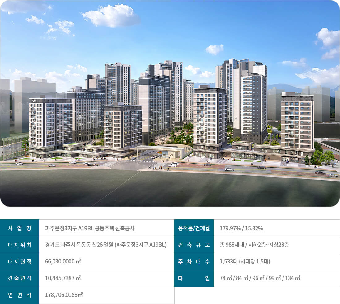 | 사업명 | 파주운정3지구 A19BL 공동주택 신축공사 |
